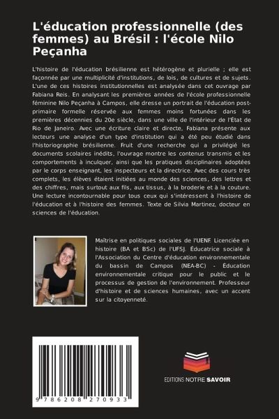 L'histoire de l'éducation brésilienne est hétérogène et plurielle ; elle est façonnée par une multiplicité d'institutions, de lois, de cultures et de sujets. L'une de ces histoires institutionnelles est analysée dans cet ouvrage par Fabiana Reis. En analysant les premières années de l'école professionnelle féminine Nilo Peçanha à Campos, elle dresse un portrait de l'éducation post-primaire formelle réservée aux femmes moins fortunées dans les premières décennies du 20e siècle, dans une ville de l'intérieur de l'État de Rio de Janeiro. Avec une écriture claire et directe, Fabiana présente aux lecteurs une analyse d'un type d'institution qui a été peu étudié dans l'historiographie brésilienne. Fruit d'une recherche qui a privilégié les documents scolaires inédits, l'ouvrage montre les contenus transmis et les comportements à inculquer, ainsi que les pratiques disciplinaires adoptées par le corps enseignant, les inspecteurs et la directrice. Avec des cours très complets, les élèves étaient initiées au monde des sciences, des lettres et des chiffres, mais surtout aux fils, aux tissus, à la broderie et à la couture. Une lecture incontournable pour tous ceux qui s'intéressent à l'histoire de l'éducation et à l'histoire des femmes. Texte de Silvia Martinez, docteur en sciences de l'éducation.