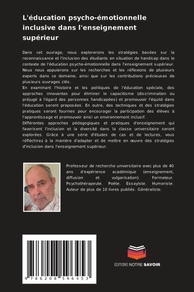Dans cet ouvrage, nous explorerons les stratégies basées sur la reconnaissance et l'inclusion des étudiants en situation de handicap dans le contexte de l'éducation psycho-émotionnelle dans l'enseignement supérieur. Nous nous appuierons sur les recherches et les réflexions de plusieurs experts dans ce domaine, ainsi que sur les contributions précieuses de plusieurs ouvrages clés.En examinant l'histoire et les politiques de l'éducation spéciale, des approches innovantes pour éliminer le capacitisme (discrimination ou préjugé à l'égard des personnes handicapées) et promouvoir l'équité dans l'éducation seront proposées. En outre, des techniques et des stratégies pratiques seront fournies pour encourager la participation des élèves à l'apprentissage et promouvoir ainsi un environnement inclusif.Différentes approches pédagogiques et pratiques d'enseignement qui favorisent l'inclusion et la diversité dans la classe universitaire seront explorées. Grâce à une série d'études de cas et de lectures, vous réfléchirez à la manière d'adapter et de mettre en oeuvre des stratégies d'inclusion dans l'enseignement supérieur.