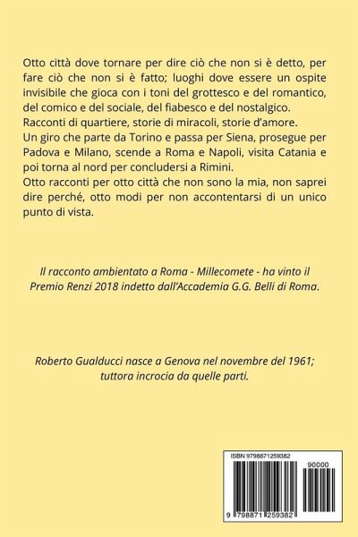 Otto città. Otto storie. Otto modi di raccontare il destino. C'è chi cerca l'amore e chi lo trova nel posto sbagliato. Chi vede il proprio futuro da una finestra e chi scopre di aver vissuto una vita che non è la sua. Una città per ogni amore, possibile o impossibile che sia. Da Torino a Rimini, passando per Milano, Roma e Napoli, Le altre città è un viaggio ironico, malinconico e surreale nell'Italia dei piccoli miracoli. Torino; la frenesia erotica di Prosdocimo s'imbatte nel transfert romantico della signora Franca. A Siena, la bella Ale guarda dentro la finestra che le mostra il futuro. Padova; il piccolo calciatore Tiin incontra Gianni Rivera, il grande campione. La pop-star Diana è a Milano per rilanciare la sua carriera dal salotto televisivo di RaiTre. Roma; Ambra e Giulio litigano in continuazione, ma il loro è amore vero. Come sarebbe stata Napoli se l'opera di un inventore geniale e sfortunato non l'avesse resa tanto preziosa? A Catania è in atto un torneo di biliardo per salire di categoria: dei quattro sfidanti, chi sarà il cornuto che riuscirà nell'impresa? A Rimini, Donato ci racconta la sua avventura con Barbara, la ferita che non rimargina e che farà di lui un mostro da prima pagina. Otto città, otto luoghi dove tornare e dire ciò che non si è detto, a fare ciò che si doveva fare e non si è fatto. Otto racconti in cui i toni vanno dal grottesco al romantico, dal fiabesco al comico, dal pittoresco al sociale.