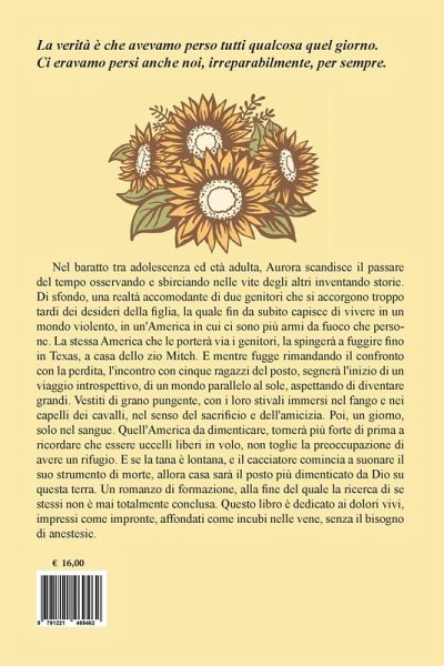 Nel baratto tra adolescenza ed età adulta, Aurora scandisce il passare del tempo osservando e sbirciando nelle vite degli altri inventando storie. Di sfondo, una realtà accomodante di due genitori che si accorgono troppo tardi dei desideri della figlia, la quale fin da subito capisce di vivere in un mondo violento, in un'America in cui ci sono più armi da fuoco che persone. La stessa America che le porterà via i genitori, la spingerà a fuggire fino in Texas, a casa dello zio Mitch. E mentre fugge rimandando il confronto con la perdita, l'incontro con cinque ragazzi del posto segnerà l'inizio di un viaggio introspettivo, di un mondo parallelo al sole, aspettando di diventare grandi. Vestiti di grano pungente, con i loro stivali immersi nel fango e nei capelli dei cavalli, nel senso del sacrificio e dell'amicizia. Poi, un giorno, solo nel sangue. Quell'America da dimenticare, tornerà più forte di prima a ricordare che essere uccelli liberi in volo non toglie la preoccupazione di avere un rifugio. E se la tana è lontana, e il cacciatore comincia a suonare il suo strumento di morte, allora casa sarà il posto più dimenticato da Dio su questa terra. Un romanzo di formazione, alla fine del quale la ricerca di se stessi non è mai totalmente conclusa. Questo libro è dedicato ai dolori vivi, impressi come impronte, affondati come incubi nelle vene, senza il bisogno di anestesie.