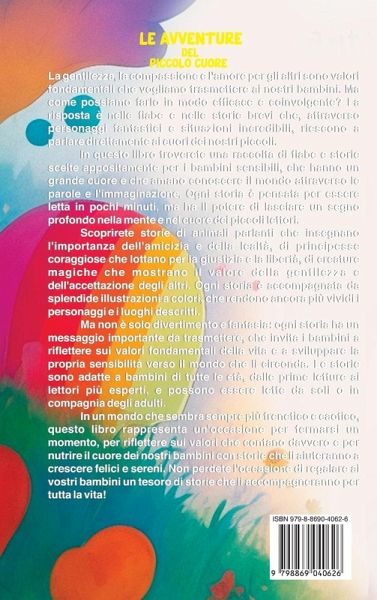 La gentilezza, la compassione e l'amore per gli altri sono valori fondamentali che vogliamo trasmettere ai nostri bambini. Ma come possiamo farlo in modo efficace e coinvolgente? La risposta è nelle fiabe e nelle storie brevi che, attraverso personaggi fantastici e situazioni incredibili, riescono a parlare direttamente ai cuori dei nostri piccoli. In questo libro troverete una raccolta di fiabe e storie scelte appositamente per i bambini sensibili, che hanno un grande cuore e che amano conoscere il mondo attraverso le parole e l'immaginazione. Ogni storia è pensata per essere letta in pochi minuti, ma ha il potere di lasciare un segno profondo nella mente e nel cuore dei piccoli lettori. Scoprirete storie di animali parlanti che insegnano l'importanza dell'amicizia e della lealtà, di principesse coraggiose che lottano per la giustizia e la libertà, di creature magiche che mostrano il valore della gentilezza e dell'accettazione degli altri. Ogni storia è accompagnata da splendide illustrazioni a colori, che rendono ancora più vividi i personaggi e i luoghi descritti. Ma non è solo divertimento e fantasia: ogni storia ha un messaggio importante da trasmettere, che invita i bambini a riflettere sui valori fondamentali della vita e a sviluppare la propria sensibilità verso il mondo che li circonda. Le storie sono adatte a bambini di tutte le età, dalle prime letture ai lettori più esperti, e possono essere lette da soli o in compagnia degli adulti. In un mondo che sembra sempre più frenetico e caotico, questo libro rappresenta un'occasione per fermarsi un momento, per riflettere sui valori che contano davvero e per nutrire il cuore dei nostri bambini con storie che li aiuteranno a crescere felici e sereni. Non perdete l'occasione di regalare ai vostri bambini un tesoro di storie che li accompagneranno per tutta la vita!