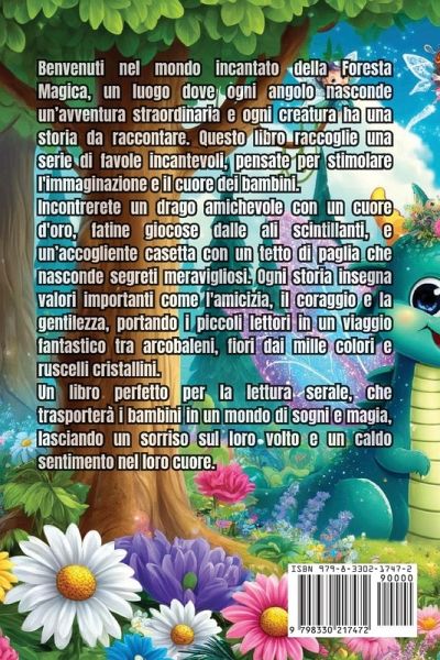 Benvenuti nel mondo incantato della Foresta Magica, un luogo dove ogni angolo nasconde un'avventura straordinaria e ogni creatura ha una storia da raccontare. Questo libro raccoglie una serie di favole incantevoli, pensate per stimolare l'immaginazione e il cuore dei bambini. Incontrerete un drago amichevole con un cuore d'oro, fatine giocose dalle ali scintillanti, e un'accogliente casetta con un tetto di paglia che nasconde segreti meravigliosi. Ogni storia insegna valori importanti come l'amicizia, il coraggio e la gentilezza, portando i piccoli lettori in un viaggio fantastico tra arcobaleni, fiori dai mille colori e ruscelli cristallini. Un libro perfetto per la lettura serale, che trasporterà i bambini in un mondo di sogni e magia, lasciando un sorriso sul loro volto e un caldo sentimento nel loro cuore.