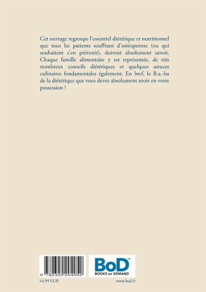 Cet ouvrage regroupe l'essentiel diététique et nutritionnel que tous les patients souffrant d'ostéoporose (ou qui souhaitent s'en prévenir), doivent absolument savoir. Chaque famille alimentaire y est représentée, de très nombreux conseils diététiques et quelques astuces culinaires fondamentales également. En bref, le B.a.-ba de la diététique que vous devez absolument avoir en votre possession !