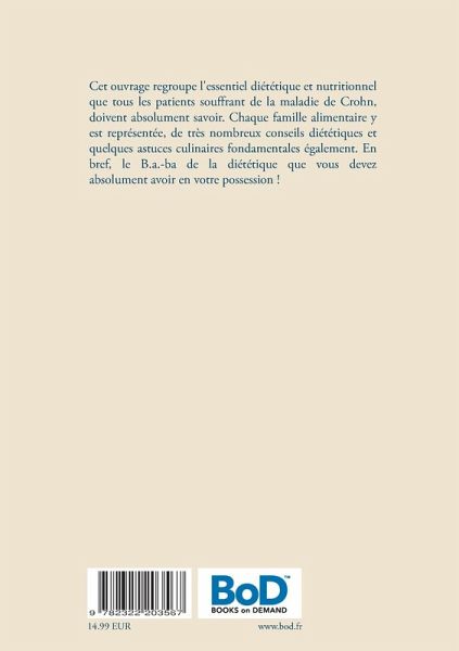 Cet ouvrage regroupe l'essentiel diététique et nutritionnel que tous les patients souffrant de la maladie de Crohn, doivent absolument savoir. Chaque famille alimentaire y est représentée, de très nombreux conseils diététiques et quelques astuces culinaires fondamentales également. En bref, le B.a.-ba de la diététique que vous devez absolument avoir en votre possession !