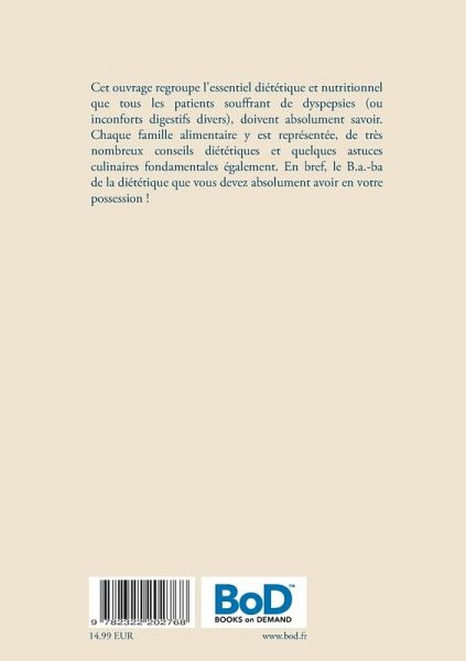 Cet ouvrage regroupe l'essentiel diététique et nutritionnel que tous les patients souffrant de dyspepsies (ou inconforts digestifs divers), doivent absolument savoir. Chaque famille alimentaire y est représentée, de très nombreux conseils diététiques et quelques astuces culinaires fondamentales également. En bref, le B.a.-ba de la diététique que vous devez absolument avoir en votre possession !