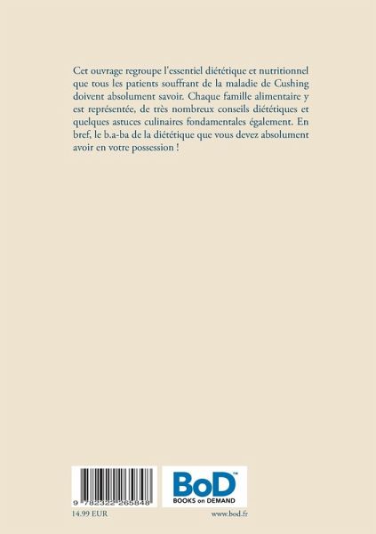 Cet ouvrage regroupe l'essentiel diététique et nutritionnel que tous les patients souffrant de la maladie de Cushing doivent absolument savoir. Chaque famille alimentaire y est représentée, de très nombreux conseils diététiques et quelques astuces culinaires fondamentales également. En bref, le b.a-ba de la diététique que vous devez absolument avoir en votre possession !