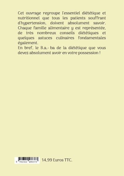 Cet ouvrage regroupe l'essentiel diététique et nutritionnel que tous les patients souffrant d'hypertension, doivent absolument savoir. Chaque famille alimentaire y est représentée, de très nombreux conseils diététiques et quelques astuces culinaires fondamentales également. En bref, le B.a.-ba de la diététique que vous devez absolument avoir en votre possession !