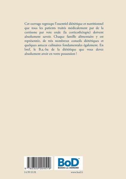 Cet ouvrage regroupe l'essentiel diététique et nutritionnel que tous les patients traités médicalement par de la cortisone par voie orale (la corticothérapie) doivent absolument savoir. Chaque famille alimentaire y est représentée, de très nombreux conseils diététiques et quelques astuces culinaires fondamentales également. En bref, le B.a.-ba de la diététique que vous devez absolument avoir en votre possession !