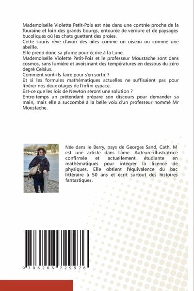 Mademoiselle Violette Petit-Pois est née dans une contrée proche de la Touraine et loin des grands bourgs, entourée de verdure et de paysages bucoliques où les chats guettent des proies.Cette souris rêve d'avoir des ailes comme un oiseau ou comme une abeille.Elle prend donc sa plume pour écrire à la Lune.Mademoiselle Violette Petit-Pois et le professeur Moustache sont dans cosmos, sans lumière et avoisinant des températures en dessous du zéro degré Celsius.Comment vont-ils faire pour s'en sortir ?Et si les formules mathématiques actuelles ne suffisaient pas pour libérer nos deux otages de l'infini espace.Est-ce que les lois de Newton seront une solution ?Entre-temps un prétendant prépare son discours pour demander sa main, mais elle a succombé à la belle voix d'un professeur nommé Mr Moustache.