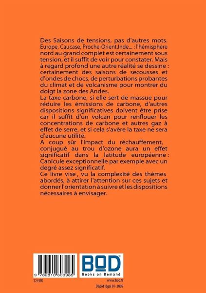 Des Saisons de tensions, pas d'autres mots. Europe, Caucase, Proche-Orient,Inde... : l'hémisphère nord au grand complet est certainement sous tension, et il suffit de voir pour constater. Mais à regard profond une autre réalité se dessine: certainement des saisons de secousses et d'ondes de chocs, de perturbations probantes du climat et de volcanisme pour montrer du doigt la zone des Andes.La taxe carbone, si elle sert de massue pour réduire les émissions de carbone, d'autres dispositions significatives doivent être prises car il suffit d'un volcan pour renflouer les concentrations de carbone et autres gaz à effet de serre, et si cela s'avère, la taxe ne sera d'aucune utilité.A coup sûr l'impact du réchauffement, conjugué au trou d'ozone aura un effet significatif dans la latitude européenne : canicule exceptionnelle par exemple avec un degré assez significatif.Ce livre vise, vu la complexité des thèmes abordés, à attirer l'attention sur ces sujets et donner l'orientation à suivre et les dispositions nécessaires à envisager.