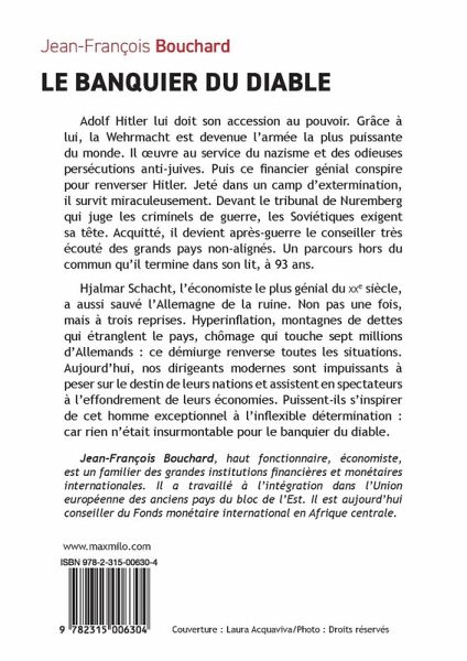 Adolf Hitler lui doit son accession au pouvoir. Grâce à lui, la Wehrmacht est devenue l'armée la plus puissante du monde. Il oeuvre au service du nazisme et des odieuses persécutions anti-juives. Puis ce financier génial conspire pour renverser Hitler. Jeté dans un camp d'extermination, il survit miraculeusement. Devant le tribunal de Nuremberg qui juge les criminels de guerre, les Soviétiques exigent sa tête. Acquitté, il devient après-guerre le conseiller très écouté des grands pays non-alignés. Un parcours hors du commun qu'il termine dans son lit, à 93 ans.Hjalmar Schacht, l'économiste le plus génial du xxe siècle, a aussi sauvé l'Allemagne de la ruine. Non pas une fois, mais à trois reprises. Hyperinflation, montagnes de dettes qui étranglent le pays, chômage qui touche sept millions d'Allemands: ce démiurge renverse toutes les situations. Aujourd'hui, nos dirigeants modernes sont impuissants à peser sur le destin de leurs nations et assistent en spectateurs à l'effondrement de leurs économies. Puissent-ils s'inspirer de cet homme exceptionnel à l'inflexible détermination: car rien n'était insurmontable pour le banquier du diable.