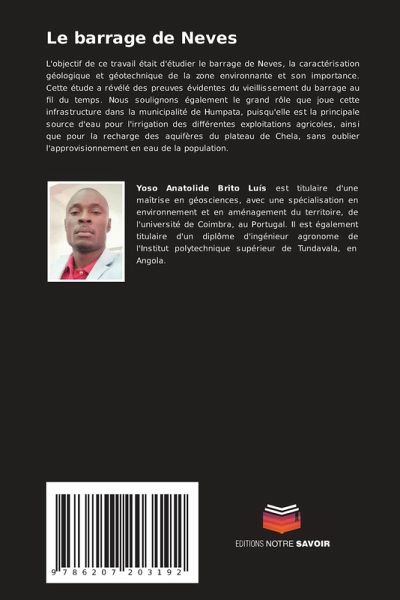 L'objectif de ce travail était d'étudier le barrage de Neves, la caractérisation géologique et géotechnique de la zone environnante et son importance. Cette étude a révélé des preuves évidentes du vieillissement du barrage au fil du temps. Nous soulignons également le grand rôle que joue cette infrastructure dans la municipalité de Humpata, puisqu'elle est la principale source d'eau pour l'irrigation des différentes exploitations agricoles, ainsi que pour la recharge des aquifères du plateau de Chela, sans oublier l'approvisionnement en eau de la population.