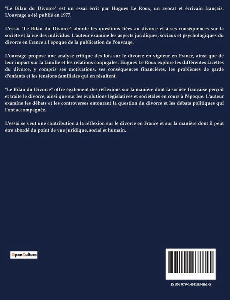 "Le Bilan du Divorce" est un essai écrit par Hugues Le Roux, un avocat et écrivain français. L'ouvrage a été publié en 1977. L'essai "Le Bilan du Divorce" aborde les questions liées au divorce et à ses conséquences sur la société et la vie des individus. L'auteur examine les aspects juridiques, sociaux et psychologiques du divorce en France à l'époque de la publication de l'ouvrage. L'ouvrage propose une analyse critique des lois sur le divorce en vigueur en France, ainsi que de leur impact sur la famille et les relations conjugales. Hugues Le Roux explore les différentes facettes du divorce, y compris ses motivations, ses conséquences financières, les problèmes de garde d'enfants et les tensions familiales qui en résultent. "Le Bilan du Divorce" offre également des réflexions sur la manière dont la société française perçoit et traite le divorce, ainsi que sur les évolutions législatives et sociétales en cours à l'époque. L'auteur examine les débats et les controverses entourant la question du divorce et les débats politiques qui l'ont accompagnée. L'essai se veut une contribution à la réflexion sur le divorce en France et sur la manière dont il peut être abordé du point de vue juridique, social et humain.
