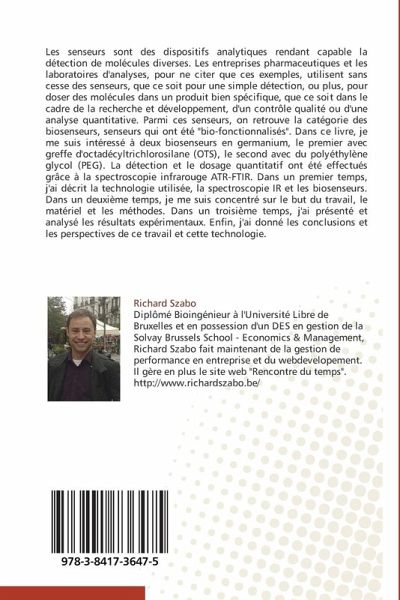 Les senseurs sont des dispositifs analytiques rendant capable la détection de molécules diverses. Les entreprises pharmaceutiques et les laboratoires d'analyses, pour ne citer que ces exemples, utilisent sans cesse des senseurs, que ce soit pour une simple détection, ou plus, pour doser des molécules dans un produit bien spécifique, que ce soit dans le cadre de la recherche et développement, d'un contrôle qualité ou d'une analyse quantitative. Parmi ces senseurs, on retrouve la catégorie des biosenseurs, senseurs qui ont été "bio-fonctionnalisés". Dans ce livre, je me suis intéressé à deux biosenseurs en germanium, le premier avec greffe d'octadécyltrichlorosilane (OTS), le second avec du polyéthylène glycol (PEG). La détection et le dosage quantitatif ont été effectués grâce à la spectroscopie infrarouge ATR-FTIR. Dans un premier temps, j'ai décrit la technologie utilisée, la spectroscopie IR et les biosenseurs. Dans un deuxième temps, je me suis concentré sur le but du travail, le matériel et les méthodes. Dans un troisième temps, j'ai présenté et analysé les résultats expérimentaux. Enfin, j'ai donné les conclusions et les perspectives de ce travail et cette technologie.