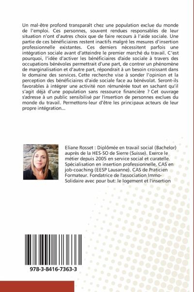 Un mal-être profond transparaît chez une population exclue du monde de l'emploi. Ces personnes, souvent rendues responsables de leur situation n'ont d'autres choix que de faire recours à l'aide sociale. Une partie de ces bénéficiaires restent inactifs malgré les mesures d'insertion professionnelle existantes. Ces derniers nécessitent parfois une intégration sociale avant d'atteindre le premier marché du travail. C'est pourquoi, l'idée d'activer les bénéficiaires d'aide sociale à travers des occupations bénévoles permettrait d'une part, de contrer un phénomène de marginalisation et d'autre part, répondrait à un besoin croissant dans le domaine des services. Cette recherche vise à sonder l'opinion et la perception des bénéficiaires d'aide sociale face au bénévolat. Seront-ils favorables à intégrer une activité non rémunérée tout en sachant qu'il s'agit déjà d'une population sans ressource financière ? Cet ouvrage s'adresse à un public sensibilisé par l'insertion de personnes exclues du monde du travail. Permettons-leur d'être les principaux acteurs de leur propre intégration...
