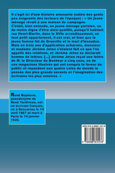 Il s'agit ici d'une histoire amusante (satire des goûts peu exigeants des lecteurs de l'époque) : Un jeune ménage rêvait à une maison de campagne. C'était, bien entendu, un jeune ménage parisien, ou du moins digne d'être ainsi qualifié, puisqu'il habitait rue Henri-Martin, dans le XVIe arrondissement, un tout petit appartement, il est vrai, et bien que la jeune femme fût de Granville et le mari d'Issoudun. Mais en trois ans d'application acharnée, monsieur et madame Jérôme Jeton s'étaient fait ce que l'on appelle des relations, et Jérôme Jeton se déclarait homme de lettres. [...] Jérôme Jeton reçut une lettre de M. le Directeur du Bonheur à cinq sous, un de ces magazines illustrés qui ont conquis la faveur du public et répandent aux quatre coins du monde la pensée des plus grands savants et l'imagination des écrivains les plus notoires.