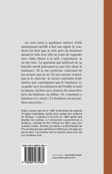 « Je suis assis à quelques mètres d'elle maintenant qu'elle a fini son appel. Je voudrais lui dire que je suis près du bonheur quand je suis avec elle en train de regarder une vidéo idiote à la télé. Cependant, je ne dis rien. La question qui jaillirait de sa bouche serait pourquoi ne pas être dans le bonheur ? Et je me sentirais contraint de lui avouer que je ne l'ai pas encore trouvé, que je le cherche. Je serais contraint d'admettre par conséquent que le bonheur, j'y ai goûté avec la naissance de Freddy et puis la sienne. Qu'être avec Joanna fut aussi être près du bonheur au début. Or, comment y pénétrer et y rester ? Le bonheur est un parfum sans nom. »