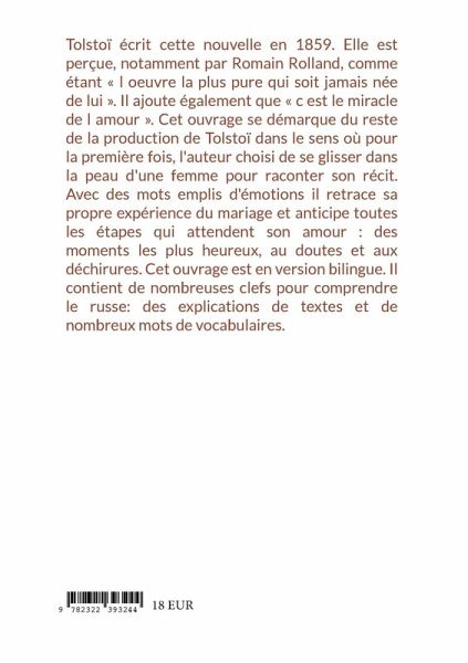 Tolstoï écrit cette nouvelle en 1859. Elle est perçue, notamment par Romain Rolland, comme étant « l oeuvre la plus pure qui soit jamais née de lui ». Il ajoute également que « c est le miracle de l amour ». Cet ouvrage se démarque du reste de la production de Tolstoï dans le sens où pour la première fois, l'auteur choisi de se glisser dans la peau d'une femme pour raconter son récit. Avec des mots emplis d'émotions il retrace sa propre expérience du mariage et anticipe toutes les étapes qui attendent son amour : des moments les plus heureux, au doutes et aux déchirures. Cet ouvrage est en version bilingue. Il contient de nombreuses clefs pour comprendre le russe: des explications de textes et de nombreux mots de vocabulaires.