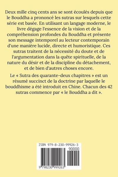 Deux mille cinq cents ans se sont écoulés depuis que le Bouddha a prononcé les sutras sur lesquels cette série est basée. En utilisant un langage moderne, le livre dégage l'essence de la vision et de la compréhension profondes du Bouddha et présente son message intemporel au lecteur contemporain d'une manière lucide, directe et humoristique. Ces sutras traitent de la nécessité du doute et de l'argumentation dans la quête spirituelle, de la nature du désir et de la discipline du détachement, et de bien d'autres choses encore. Le Sutra des quarante-deux chapitres est un résumé succinct de la doctrine par laquelle le bouddhisme a été introduit en Chine. Chacun des 42 sutras commence par le Bouddha a dit .