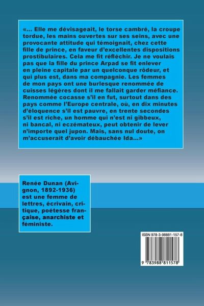 ... Elle me dévisageait, le torse cambré, la croupe tordue, les mains ouvertes sur ses seins, avec une provocante attitude qui témoignait, chez cette fille de prince, en faveur d'excellentes dispositions prostibulaires. Cela me fit réfléchir. Je ne voulais pas que la fille du prince Arpad se fit enlever en pleine capitale par un quelconque rôdeur, et qui plus est, dans ma compagnie. Les femmes de mon pays ont une burlesque renommée de cuisses légères dont il me fallait garder méfiance. Renommée cocasse s'il en fut, surtout dans des pays comme l'Europe centrale, où, en dix minutes d'éloquence s'il est pauvre, en trente secondes s'il est riche, un homme qui n'est ni gibbeux, ni bancal, ni eczémateux, peut obtenir de lever n'importe quel jupon. Mais, sans nul doute, on m'accuserait d'avoir débauchée Ida...
