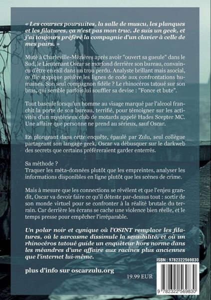 ' Les courses poursuites, la salle de muscu, les planques et les filatures, ça n'est pas mon truc. Je suis un geek, et j'ai toujours préféré la compagnie d'un clavier à celle de mes pairs. ' Muté à Charleville-Mézières après avoir "ouvert sa gueule" dans le Sud, le Lieutenant Oscar se morfond derrière son bureau, convaincu d'être en exil dans un trou perdu. Analyste brillant mais asocial, ce flic atypique préfère les lignes de code aux confrontations humaines. Son seul compagnon fidèle ? Le rhinocéros tatoué sur son bras, qui semble parfois lui souffler sa devise : "Fonce et bute". Tout bascule lorsqu'un homme au visage marqué par l'alcool franchit la porte de son bureau, terrifié, pour témoigner sur les activités d'un mystérieux club de motards appelé Hades Scepter MC. Une affaire que personne ne prend au sérieux, sauf Oscar. En plongeant dans cette enquête, épaulé par Zulu, seul collègue partageant son langage geek, Oscar va débusquer sur le darkweb des secrets que certains préféreraient garder enterrés. Sa méthode ? Traquer les méta-données plutôt que les empreintes, analyser les informations disponibles en ligne plutôt que les scènes de crime. Mais à mesure que les connections se révèlent et que l'enjeu grandit, Oscar va devoir faire ce qu'il déteste par-dessus tout : sortir de son monde virtuel pour se confronter à la réalité brutale du terrain. Car derrière les écrans se cache une violence bien réelle, et le temps presse pour empêcher l'irréparable. Un polar noir et cynique où l'OSINT remplace les filatures, où le sarcasme dissimule la sensibilité, et où un rhinocéros tatoué guide un enquêteur hors norme dans les méandres d'une affaire aux racines plus anciennes que l'internet lui-même.
