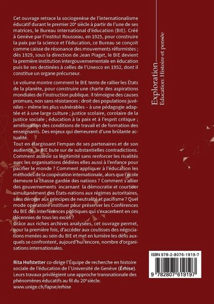 Rita Hofstetter : L'Institut Rousseau - emblème de l'esprit de Genève - fondateur du BIE (début du 20e siècle) - Rita Hofstetter : « Ut per juvenes ascendat mundus ». Le pari périlleux de fédérer les mouvements sociaux (1925- 1929) - Rita Hofstetter et Cécile Boss : Se positionner comme organisation inter- gouvernementale (1929- 1939) - Cécile Boss, Émeline Brylinski et Joëlle Droux : Agir quand même : le Service d'aide intellectuelle aux prisonniers de guerre (1939- 1945) - Émeline Brylinski : Justifier le BIE et son expertise face à l'Unesco (1945- 1952) - Émeline Brylinski et Rita Hofstetter : Le mode opératoire des Conférences internationales de l'instruction publique - Rita Hofstetter et Anne Monnier : Prolongation de la scolarité et accès aux filières du secondaire : une cause controversée - Joëlle Droux, Cécile Boss et Frédéric Mole : Classes spéciales, écoles rurales : différencier pour reconstruire un universel - « La garderie est devenue une école » : l'éducation préscolaire comme cause en devenir - Aurélie De Mestral, Viviane Rouiller et Anouk Darme- Xu : Les CIIPs au prisme des disciplines, programmes et manuels scolaires - Bernard Schneuwly, Anouk Darme- Xu, Blaise Extermann, Irina Leopoldoff et Viviane Rouiller : Des pratiques éducatives langagières au service de la compréhension internationale ? - Sylviane Tinembart et Valérie Lussi Borer : Améliorer la formation, les qualifications et les conditions de travail des enseignants - Cécile Boss, Rita Hofstetter et Bernard Schneuwly : Le BIE et l'éducation nouvelle : confluences et dissonances - Frédéric Mole : Convergences, coopérations et concurrences avec les fédérations internationales d'enseignants - Marie- Élise Hunyadi : Les associations internationales féminines : de discrètes collaboratrices devenues instigatrices d'une CIIP - Cécile Boss : Appartenances, affiliations et réseaux de sociabilités des acteurs du BIE - Émeline Brylinski : Les décisionnaires : portrait de groupe de « l'intergouvernementalisme » éducatif - Michel Christian, Bernard Schneuwly, Émeline Brylinski, Irina Leopoldoff et Clarice Loureiro : Le BIE dans le monde : une géographie variable - Rita Hofstetter et Bernard Schneuwly, pour Érhise : Conclusion générale. Un Bureau précurseur, acteur de son temps - Annexes - Sources - Bibliographie .