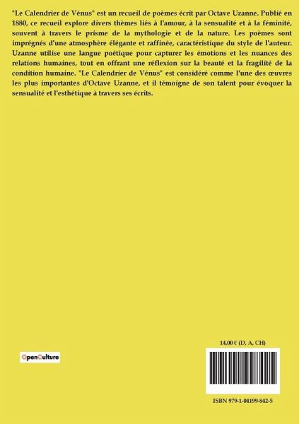 "Le Calendrier de Vénus" est un recueil de poèmes écrit par Octave Uzanne. Publié en 1880, ce recueil explore divers thèmes liés à l'amour, à la sensualité et à la féminité, souvent à travers le prisme de la mythologie et de la nature. Les poèmes sont imprégnés d'une atmosphère élégante et raffinée, caractéristique du style de l'auteur. Uzanne utilise une langue poétique pour capturer les émotions et les nuances des relations humaines, tout en offrant une réflexion sur la beauté et la fragilité de la condition humaine. "Le Calendrier de Vénus" est considéré comme l'une des ¿uvres les plus importantes d'Octave Uzanne, et il témoigne de son talent pour évoquer la sensualité et l'esthétique à travers ses écrits.