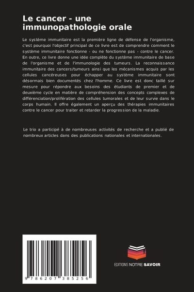 Le système immunitaire est la première ligne de défense de l'organisme, c'est pourquoi l'objectif principal de ce livre est de comprendre comment le système immunitaire fonctionne - ou ne fonctionne pas - contre le cancer. En outre, ce livre donne une idée complète du système immunitaire de base de l'organisme et de l'immunologie des tumeurs. La reconnaissance immunitaire des cancers/tumeurs ainsi que les mécanismes acquis par les cellules cancéreuses pour échapper au système immunitaire sont désormais bien documentés chez l'homme. Ce livre est donc taillé sur mesure pour répondre aux besoins des étudiants de premier et de deuxième cycle en matière de compréhension des concepts complexes de différenciation/prolifération des cellules tumorales et de leur survie dans le corps humain. Il offre également un aperçu des thérapies immunitaires contre le cancer pour traiter et retarder la progression de la maladie.