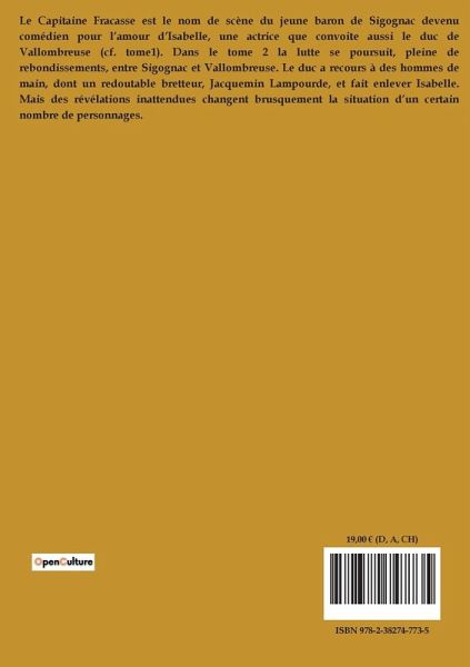 Le Capitaine Fracasse est le nom de scène du jeune baron de Sigognac devenu comédien pour l¿amour d¿Isabelle, une actrice que convoite aussi le duc de Vallombreuse (cf. tome1). Dans le tome 2 la lutte se poursuit, pleine de rebondissements, entre Sigognac et Vallombreuse. Le duc a recours à des hommes de main, dont un redoutable bretteur, Jacquemin Lampourde, et fait enlever Isabelle. Mais des révélations inattendues changent brusquement la situation d¿un certain nombre de personnages.