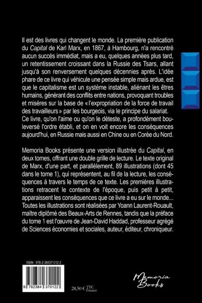 Il est des livres qui changent le monde. La première publication du Capital de Karl Marx, en 1867, à Hambourg, n'a rencontré aucun succès immédiat, mais a eu, quelques années plus tard, un retentissement croissant dans la Russie des Tsars, allant jusqu'à son renversement quelques décennies après. L'idée phare de ce livre qui véhicule une pensée simple mais ardue, est que le capitalisme est un système instable, aliénant les êtres humains, générant des conflits entre nations, provoquant troubles et misères sur la base de «¿l¿expropriation de la force de travail des travailleurs¿» par les bourgeois, via le principe du salariat. Ce livre, qu'on l'aime ou qu'on le déteste, a profondément bouleversé l'ordre établi, et on en voit encore les conséquences aujourd'hui, en Russie mais aussi en Chine ou en Corée du Nord. Memoria Books présente une version illustrée du Capital, en deux tomes, offrant une double grille de lecture. Le texte original de Marx, d'une part, et parallèlement, 89 illustrations (dont 45 dans le tome 1), qui représentent, au fil de la lecture, les conséquences à travers le temps de ce texte. Les premières illustrations retracent le contexte de l'époque, puis petit à petit, apparaissent les conséquences que ce livre a eu sur le monde... Toutes les illustrations sont réalisées par Yoann Laurent-Rouault, maître diplômé des Beaux-Arts de Rennes, tandis que la préface du tome 1 est l'¿uvre de Jean-David Haddad, professeur agrégé de Sciences économies et sociales, auteur, éditeur, chroniqueur.