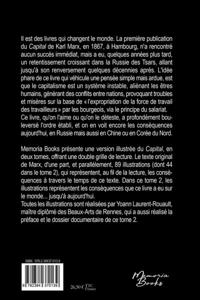 Il est des livres qui changent le monde. La première publication du Capital de Karl Marx, en 1867, à Hambourg, n'a rencontré aucun succès immédiat, mais a eu, quelques années plus tard, un retentissement croissant dans la Russie des Tsars, allant jusqu'à son renversement quelques décennies après. L'idée phare de ce livre qui véhicule une pensée simple mais ardue, est que le capitalisme est un système instable, aliénant les êtres humains, générant des conflits entre nations, provoquant troubles et misères sur la base de «¿l¿expropriation de la force de travail des travailleurs¿» par les bourgeois, via le principe du salariat. Ce livre, qu'on l'aime ou qu'on le déteste, a profondément bouleversé l'ordre établi, et on en voit encore les conséquences aujourd'hui, en Russie mais aussi en Chine ou en Corée du Nord. Memoria Books présente une version illustrée du Capital, en deux tomes, offrant une double grille de lecture. Le texte original de Marx, d'une part, et parallèlement, 89 illustrations (dont 44 dans le tome 2), qui représentent, au fil de la lecture, les conséquences à travers le temps de ce texte. Dans ce tome 2, les illustrations représentent les conséquences que ce livre a eu sur le monde... jusqu'à aujourd'hui. Toutes les illustrations sont réalisées par Yoann Laurent-Rouault, maître diplômé des Beaux-Arts de Rennes, qui a aussi réalisé la préface et le dossier documentaire de ce tome 2.