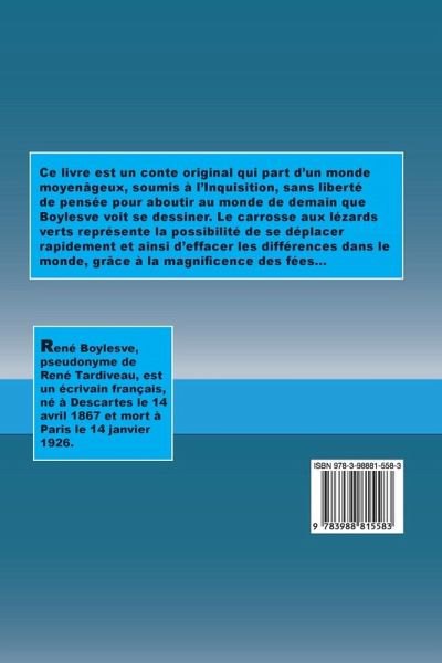 Ce livre est un conte original qui part d'un monde moyenâgeux, soumis à l'Inquisition, sans liberté de pensée pour aboutir au monde de demain que Boylesve voit se dessiner. Le carrosse aux lézards verts représente la possibilité de se déplacer rapidement et ainsi d'effacer les différences dans le monde, grâce à la magnificence des fées...