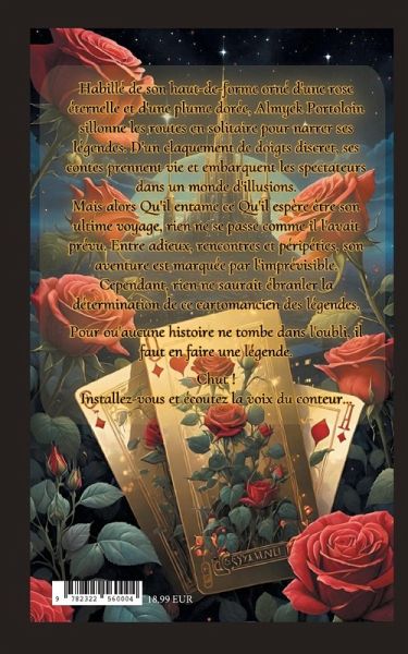 Habillé de son haut-de-forme orné d'une rose éternelle et d'une plume dorée, Almyek Portoloin sillonne les routes en solitaire pour narrer ses légendes. D'un claquement de doigts discret, ses contes prennent vie et embarquent les spectateurs dans un monde d'illusion. Mais alors qu'il entame ce qu'il espère être son ultime voyage, rien ne se passe comme il l'avait prévu. Entre adieux, rencontres et péripéties, son aventure est marquée par l'imprévisible. Cependant rien ne saurait ébranler la détermination de ce cartomancien des légendes. Pour qu'aucune histoire ne tombe dans l'oubli, il faut en faire une légende. Chut ! Installez-vous et écoutez la voix du conteur.