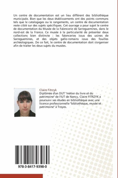 Un centre de documentation est un lieu différent des bibliothèque municipale. Bien que les deux établissements ont des points communs tels que le catalogages ou le rangements, un centre de documentation reste ciblé sur des sujets spécifiques. Cet ouvrage a pour sujet le centre de documentation du Musée de la Faïencerie de Sarreguemines, dans le nord-est de la France. Ce musée à la particularité de présenter deux collections bien distincte : les faïenceries issus des usines de Sarreguemines, et des objets gallo-romains issus des fouilles archéologiques. De ce fait, le centre de documentation doit s'organiser afin de traiter les deux sujets du musées.