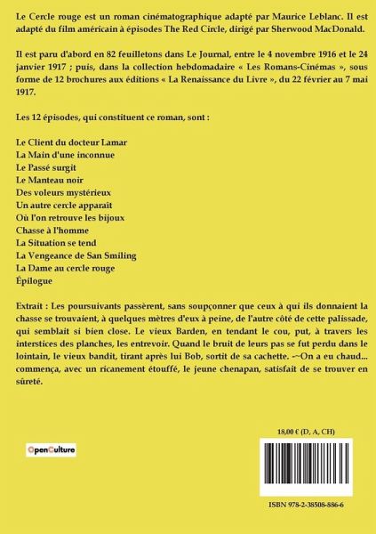 Le Cercle rouge est un roman cinématographique adapté par Maurice Leblanc. Il est adapté du film américain à épisodes The Red Circle, dirigé par Sherwood MacDonald. Il est paru d'abord en 82 feuilletons dans Le Journal, entre le 4 novembre 1916 et le 24 janvier 1917 ; puis, dans la collection hebdomadaire « Les Romans-Cinémas », sous forme de 12 brochures aux éditions « La Renaissance du Livre », du 22 février au 7 mai 1917. Les 12 épisodes, qui constituent ce roman, sont : Le Client du docteur Lamar La Main d'une inconnue Le Passé surgit Le Manteau noir Des voleurs mystérieux Un autre cercle apparaît Où l'on retrouve les bijoux Chasse à l'homme La Situation se tend La Vengeance de San Smiling La Dame au cercle rouge Épilogue Extrait : Les poursuivants passèrent, sans soupçonner que ceux à qui ils donnaient la chasse se trouvaient, à quelques mètres d'eux à peine, de l'autre côté de cette palissade, qui semblait si bien close. Le vieux Barden, en tendant le cou, put, à travers les interstices des planches, les entrevoir. Quand le bruit de leurs pas se fut perdu dans le lointain, le vieux bandit, tirant après lui Bob, sortit de sa cachette. -~On a eu chaud... commença, avec un ricanement étouffé, le jeune chenapan, satisfait de se trouver en sûreté.