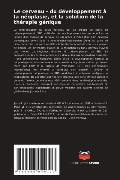 La différenciation du tissu nerveux, qui se produit au cours du développement du SNC, a été décrite pour la première fois en détail lors de l'étude d'un modèle de cerveau de rat grâce à l'utilisation d'un nouveau biomarqueur connu sous le nom d'alpha-foetoprotéine (AFP). Au cours de cette recherche, un autre modèle - le tératocarcinome de souris - a permis de décrire les différentes étapes de la formation du tissu nerveux suivant des modes pathologiques distincts du développement du SNC. La comparaison de ces deux processus a donné lieu aux conclusions suivantes : une convergence frappante existe entre le développement normal et néoplasique du tissu nerveux et est corrélée à la présence d'oncoprotéines telles que l'AFP et le facteur de croissance IGF-I. Ces observations intéressantes ont orienté la poursuite d'un objectif : arrêter le développement néoplasique du SNC conduisant à la tumeur maligne - le glioblastome. De cet effort est née une stratégie anti-gène efficace ciblant le gène du facteur de croissance IGF-I présent dans le développement des tumeurs cérébrales, induisant une réponse immunitaire anti-tumorale et, par conséquent, augmentant la survie médiane des patients atteints de glioblastome jusqu'à 2 ans.