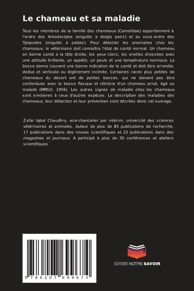 Tous les membres de la famille des chameaux (Camelidae) appartiennent à l'ordre des Artiodactyles (ongulés à doigts pairs) et au sous-ordre des Tylopodes (ongulés à pattes). Pour détecter les anomalies chez les chameaux, le vétérinaire doit connaître l'état de santé normal. Un chameau en bonne santé a la tête droite, les yeux clairs, les oreilles dressées avec une attitude brillante, un appétit, un pouls et une température normaux. La bosse donne souvent une bonne indication de la santé et doit être arrondie, dodue et verticale ou légèrement inclinée. Certaines races plus petites de chameaux du désert ont de petites bosses, qui ne doivent pas être confondues avec la bosse flasque et rétrécie d'un chameau privé, âgé ou malade (HMSO, 1956). Les autres signes de maladie chez les chameaux sont similaires à ceux d'autres espèces. La description des maladies des chameaux, leur détection et leur prévention sont décrites dans cet ouvrage.