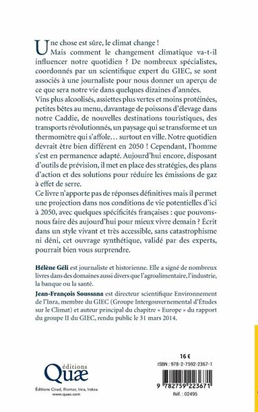 Santé, alimentation, cadre de vie... Comment le changement climatique va-t-il impacter notre quotidien ? Vins plus alcoolisés, assiettes plus vertes et moins protéinées, des petites bêtes au menu, plus de poissons d'élevage dans notre Caddie, de nouvelles destinations touristiques, des transports révolutionnés, un paysage qui se transforme et un thermomètre qui s'affole... surtout en ville. Notre quotidien devrait être bien différent en 2050 ! Ecrit sans catastrophisme ni déni, un ouvrage accessible à tous qui pourrait bien vous surprendre.