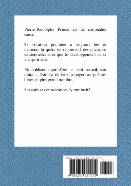 Pierre-Rodolphe Prince est de nationalité suisse. Sa vocation première a toujours été et demeure la quête de réponses à des questions existentielles ainsi que le développement de sa vie spirituelle. En publiant aujourd'hui ce petit recueil, son unique désir est de faire partager ses poèmes libres au plus grand nombre. Ses amis et connaissances l'y ont incité.