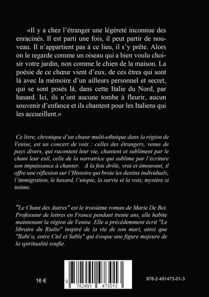 Histoire réelle d'un ch¿ur multi-ethnique dans la région de Venise, ce livre est un concert de voix : celle des autres qui chantent et pour certains racontent leur vie, celle de la narratrice qui ne chante pas mais écrit. Les chanteurs subliment par le chant leur exil, et celle qui écrit, harcelée par une voix intérieure, sublime par l'écriture son impuissance à chanter. Le récit met en valeur une galerie de portraits venant de pays les plus divers. Il offre est également une réflexion sur l'Histoire qui broie les destins individuels, le hasard, l'utopie, la survie et surtout la voix, mystère si intime.