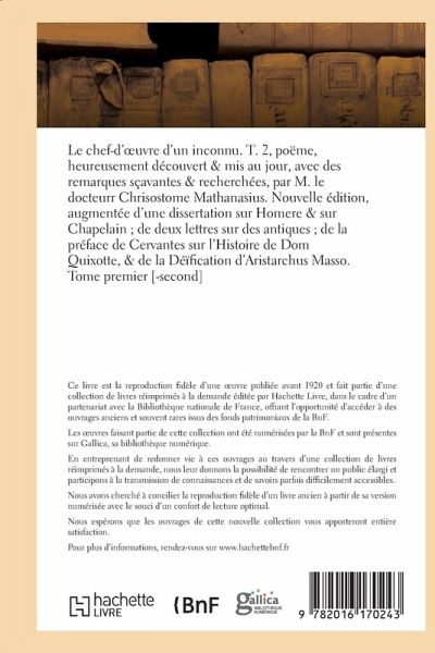 Le chef-d'oeuvre d'un inconnu. T. 2 /, poëme, heureusement découvert & mis au jour, avec des remarques sçavantes & recherchées, par M. le docteurr Chrisostome Mathanasius. Nouvelle édition, augmentée d'une dissertation sur Homere & sur Chapelain; de deux lettres sur des antiques; de la préface de Cervantes sur l'Histoire de Dom Quixotte, & de la Déïfication d'Aristarchus Masso. Tome premier [-second] Date de l'édition originale: 1758 Comprend: Dissertation sur Homere et sur Chapelain; Préface de Cervantes sur l'Histoire de Dom Quixotte Le présent ouvrage s'inscrit dans une politique de conservation patrimoniale des ouvrages de la littérature Française mise en place avec la BNF. HACHETTE LIVRE et la BNF proposent ainsi un catalogue de titres indisponibles, la BNF ayant numérisé ces oeuvres et HACHETTE LIVRE les imprimant à la demande. Certains de ces ouvrages reflètent des courants de pensée caractéristiques de leur époque, mais qui seraient aujourd'hui jugés condamnables. Ils n'en appartiennent pas moins à l'histoire des idées en France et sont susceptibles de présenter un intérêt scientifique ou historique. Le sens de notre démarche éditoriale consiste ainsi à permettre l'accès à ces oeuvres sans pour autant que nous en cautionnions en aucune façon le contenu. Pour plus d'informations, rendez-vous sur www.hachettebnf.fr