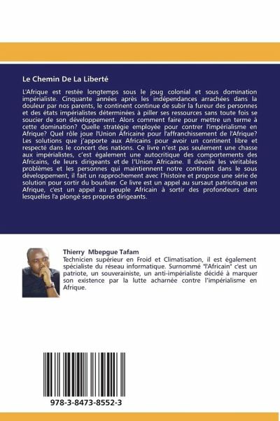 L'Afrique est restée longtemps sous le joug colonial et sous domination impérialiste. Cinquante années après les indépendances arrachées dans la douleur par nos parents, le continent continue de subir la fureur des personnes et des états impérialistes déterminées à piller ses ressources sans toute fois se soucier de son développement. Alors comment faire pour mettre un terme à cette domination? Quelle stratégie employée pour contrer l'impérialisme en Afrique? Quel rôle joue l'Union Africaine pour l'affranchissement de l'Afrique? Les solutions que j apporte aux Africains pour avoir un continent libre et respecté dans le concert des nations. Ce livre n est pas seulement une chasse aux impérialistes, c est également une autocritique des comportements des Africains, de leurs dirigeants et de l Union Africaine. Il dévoile les véritables problèmes et les personnes qui maintiennent notre continent dans le sous développement, il fait un rapprochement avec l histoire et propose une série de solution pour sortir du bourbier. Ce livre est un appel au sursaut patriotique en Afrique, c'est un appel au peuple Africain à sortir des profondeurs dans lesquelles l'a plongé ses propres dirigeants.