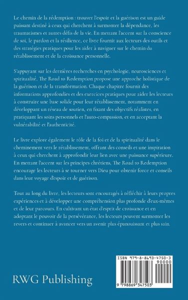 Le chemin de la rédemption : trouver l'espoir et la guérison est un guide puissant destiné à ceux qui cherchent à surmonter la dépendance, les traumatismes et autres défis de la vie. En mettant l'accent sur la conscience de soi, le pardon et la résilience, ce livre fournit aux lecteurs des outils et des stratégies pratiques pour les aider à naviguer sur le chemin du rétablissement et de la croissance personnelle. S'appuyant sur les dernières recherches en psychologie, neurosciences et spiritualité, The Road to Redemption propose une approche holistique de la guérison et de la transformation. Chaque chapitre fournit des informations approfondies et des exercices pratiques pour aider les lecteurs à construire une base solide pour leur rétablissement, notamment en développant un réseau de soutien, en fixant des objectifs réalistes, en pratiquant les soins personnels et l'auto-compassion, et en acceptant la vulnérabilité et l'authenticité. Le livre explore également le rôle de la foi et de la spiritualité dans le cheminement vers le rétablissement, offrant des conseils et une inspiration à ceux qui cherchent à approfondir leur lien avec une puissance supérieure. En mettant l'accent sur les principes chrétiens, The Road to Redemption encourage les lecteurs à se tourner vers Dieu pour obtenir force et conseils dans leur voyage d'espoir et de guérison. Tout au long du livre, les lecteurs sont encouragés à réfléchir à leurs propres expériences et à développer une compréhension plus profonde d'eux-mêmes et de leur parcours. En cultivant un état d'esprit de croissance et en adoptant le pouvoir de la persévérance, les lecteurs peuvent surmonter les revers et continuer à avancer vers un avenir plus épanouissant et plus sain. Écrit avec compassion et empathie, The Road to Redemption est une lecture incontournable pour quiconque cherche à surmonter une dépendance, un traumatisme ou d'autres défis de la vie. Que vous commenciez tout juste votre chemin de rétablissement ou que vous cherchiez à approfondir votre compréhension de vous-même et de votre foi, ce livre fournit les outils et l'inspiration dont vous avez besoin pour parvenir à une transformation et une guérison durables.