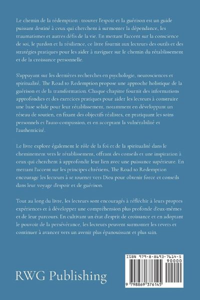 Le chemin de la rédemption : trouver l'espoir et la guérison est un guide puissant destiné à ceux qui cherchent à surmonter la dépendance, les traumatismes et autres défis de la vie. En mettant l'accent sur la conscience de soi, le pardon et la résilience, ce livre fournit aux lecteurs des outils et des stratégies pratiques pour les aider à naviguer sur le chemin du rétablissement et de la croissance personnelle. S'appuyant sur les dernières recherches en psychologie, neurosciences et spiritualité, The Road to Redemption propose une approche holistique de la guérison et de la transformation. Chaque chapitre fournit des informations approfondies et des exercices pratiques pour aider les lecteurs à construire une base solide pour leur rétablissement, notamment en développant un réseau de soutien, en fixant des objectifs réalistes, en pratiquant les soins personnels et l'auto-compassion, et en acceptant la vulnérabilité et l'authenticité. Le livre explore également le rôle de la foi et de la spiritualité dans le cheminement vers le rétablissement, offrant des conseils et une inspiration à ceux qui cherchent à approfondir leur lien avec une puissance supérieure. En mettant l'accent sur les principes chrétiens, The Road to Redemption encourage les lecteurs à se tourner vers Dieu pour obtenir force et conseils dans leur voyage d'espoir et de guérison. Tout au long du livre, les lecteurs sont encouragés à réfléchir à leurs propres expériences et à développer une compréhension plus profonde d'eux-mêmes et de leur parcours. En cultivant un état d'esprit de croissance et en adoptant le pouvoir de la persévérance, les lecteurs peuvent surmonter les revers et continuer à avancer vers un avenir plus épanouissant et plus sain. Écrit avec compassion et empathie, The Road to Redemption est une lecture incontournable pour quiconque cherche à surmonter une dépendance, un traumatisme ou d'autres défis de la vie. Que vous commenciez tout juste votre chemin de rétablissement ou que vous cherchiez à approfondir votre compréhension de vous-même et de votre foi, ce livre fournit les outils et l'inspiration dont vous avez besoin pour parvenir à une transformation et une guérison durables.