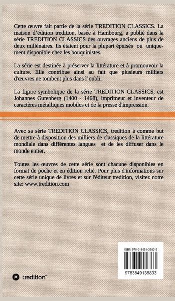 Cette uvre (édition relié) fait partie de la série TREDITION CLASSICS. La maison d édition tredition, basée à Hambourg, a publié dans la série TREDITION CLASSICS des ouvrages anciens de plus de deux millénaires. Ils étaient pour la plupart épuisés ou uniquement disponible chez les bouquinistes. La série est destinée à préserver la littérature et à promouvoir la culture. Avec sa série TREDITION CLASSICS, tredition à comme but de mettre à disposition des milliers de classiques de la littérature mondiale dans différentes langues et de les diffuser dans le monde entier.