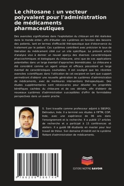Des avancées significatives dans l'exploitation du chitosan ont été réalisées dans le monde entier, afin d'étudier ces systèmes en fonction des besoins des patients, tant en termes d'efficacité thérapeutique que d'observance du traitement par le patient. Ces systèmes contrôlent avec précision le taux de libération du médicament ciblé sur un site spécifique. Le présent article d'analyse vise à donner un nouvel aperçu des diverses caractéristiques physicochimiques et biologiques du chitosane, ainsi que de ses applications potentielles dans un large éventail d'approches biomédicales. Le chitosane a été considéré comme un agent unique et efficace possédant un large éventail de caractéristiques souhaitées. Il est souligné que les récentes avancées scientifiques dans l'utilisation de cet excipient en tant que support permettront d'obtenir une nouvelle génération de systèmes d'administration de médicaments, avec de meilleures interventions thérapeutiques. Des études supplémentaires sont nécessaires pour dévoiler les propriétés bénéfiques cachées du chitosane et de ses dérivés, afin d'obtenir de nouveaux systèmes d'administration susceptibles d'offrir de formidables perspectives dans un avenir proche.