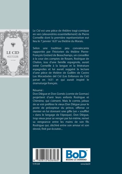 Le Cid est une pièce de théâtre tragi-comique en vers (alexandrins essentiellement) de Pierre Corneille dont la première représentation eut lieu le 7 janvier 1637 au théâtre du Marais.Origine et inspirationSelon une tradition peu convaincante rapportée par l'historien du théâtre Pierre-François Godard de Beauchamps, un conseiller à la cour des comptes de Rouen, Rodrigue de Chalon, issu d'une famille espagnole, aurait initié Corneille à la langue et la littérature espagnoles et lui aurait suggéré la lecture d'une pièce de théâtre de Guillén de Castro Las Mocedades del Cid (Les Enfances du Cid) parue en 1631 et qui aurait inspiré le dramaturge français.L'influence de Rodrigue de Chalon est incertaine, mais il est attesté que Le Cid s'inspire fortement de la pièce de Guillén de Castro, au point que Jean Mairet, dans une épître en vers anonyme, l'« Auteur du vrai Cid espagnol », écrite au traducteur français de Guillén de Castro, accuse Corneille de plagiat en mars 1637.Personnages : Don Rodrigue (Rodrigue) : fils de Don Diègue et amant de Chimène. Cid est un surnom de guerre qui ne sera rappelé qu'aux actes IV et V et uniquement par le roi et l'Infante. Le personnage s'inspire de Rodrigo Díaz de Vivar.Chimène : fille de Don Gomès et maîtresse de Don Sanche et de Don Rodrigue dont elle est aussi l'amante.Don Gomès (le comte) : comte de Gormas et père de Chimène.Don Diègue [de Bivar] : père de Don Rodrigue. Doña Urraque (l'Infante) : Infante de Castille, secrètement amoureuse de Don Rodrigue.Don Fernand : premier roi de Castille.Don Sanche : amoureux de Chimène.Elvire : gouvernante de Chimène.Léonor : gouvernante de l'Infante. Don Arias et Don Alonse : gentilshommes castillans. Lors de la création, le rôle de Rodrigue était tenu par Montdory qui dirigeait la troupe du Marais. À quarante-six ans, il était considéré comme le plus grand acteur de son temps. Chimène était jouée par la Villiers, l'Infante par la Beauchasteau, don Sanche par le Montrouge.Résumé:Don Diègue et Don Gomès (comte de Gormas) projettent d'unir leurs enfants Rodrigue et Chimène, qui s'aiment. Mais le comte, jaloux de se voir préférer le vieux Don Diègue pour le poste de précepteur du prince, offense ce dernier en lui donnant une gifle (un « soufflet » dans le langage de l'époque). Don Diègue, trop vieux pour se venger par lui-même, remet sa vengeance entre les mains de son fils Rodrigue qui, déchiré entre son amour et son devoir, finit par écouter...