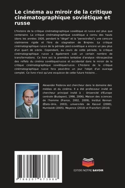 L'histoire de la critique cinématographique soviétique et russe est plus que centenaire. La critique cinématographique soviétique a connu des hauts (dans les années 1920, pendant le "dégel" et la "perestroïka"), une censure stalinienne rigide et l'ère de stagnation de Brejnev. La critique cinématographique russe de la période post-soviétique a encore un peu plus d'un quart de siècle. Cependant, au cours de cette période, la critique cinématographique russe a également subi un certain nombre de transformations. Ce livre est la première tentative d'analyse rétrospective des reflets du cinéma soviétique/russe et occidental dans le miroir de la critique cinématographique soviétique/russe. L'histoire de la critique cinématographique russe fera peut-être un jour l'objet d'un ouvrage complet. Ce livre n'est qu'une esquisse de cette future histoire...