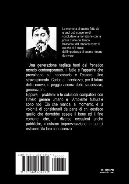 Una generazione tagliata fuori dal frenetico mondo contemporaneo. Il futile e l'apparire che prevalgono sul necessario e l'essere. Uno stravolgimento. Carico di incertezze, per il futuro delle nuove, e peggio ancora delle successive, generazioni. Eppure, i problemi e le soluzioni compatibili con l'intero genere umano e l'Ambiente Naturale sono noti. Ciò che manca, al momento, è la volontà di considerarli da parte di chi gestisce quello che dovrebbe essere il bene ed il fine comune; che, in diverse occasioni anche pubbliche, mostrano improvvisazione in campi estranei alla loro conoscenza