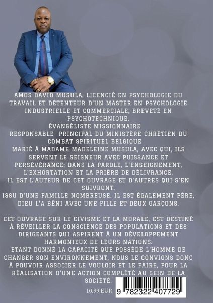 CET OUVRAGE SUR LE CIVISME ET LA MORALE, EST DESTINÉE À RÉVEILLER LA CONSCIENCE DES POPULATIONS ET DES DIRIGEANTS OUI ASPIRENT À UN DÉVELOPPEMENT HARMONIEUX DE LEURS NATIONS.ETANT DONNÉ LA CAPACITÉ QUE POSSÈDE L'HOMME DE CHANGER SON ENVIRONNEMENT, NOUS LE CONVIONS DONC À POUVOIR ASSOCIER LE VOULOIR ET LE FAIRE. POUR LA RÉALISATION D'UNE ACTION COMPLÉTÉ AU SEIN DE LA SOCIÉTÉ.